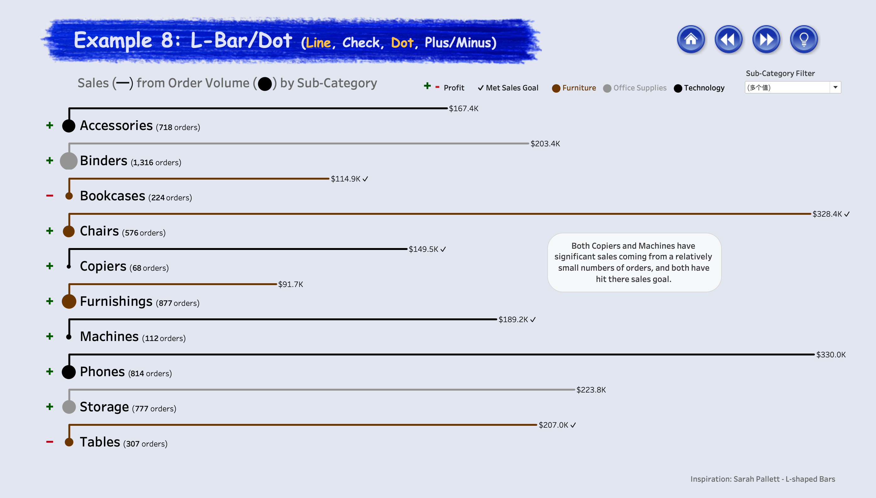 每行通过一条横线表示该子品类的销售额,并在起点用一个圆点显示订单量。