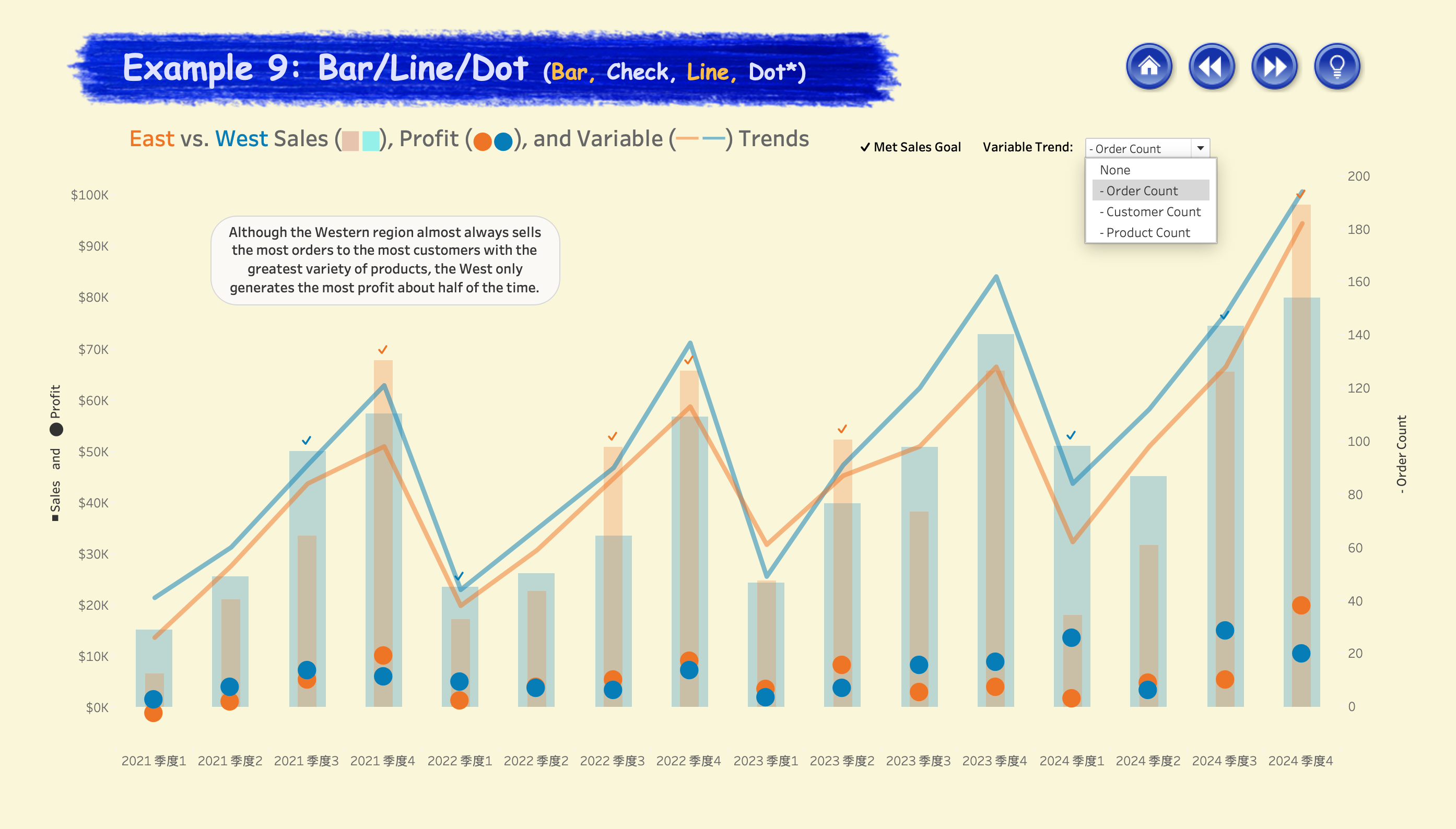 注释总结业务洞察,例如“西部区域订单数领先,但利润领先的季度却不到一半”。