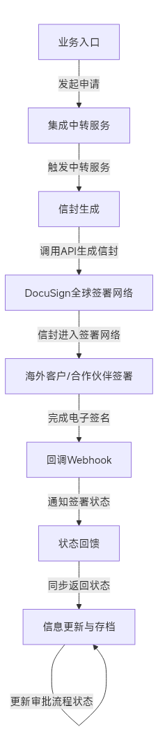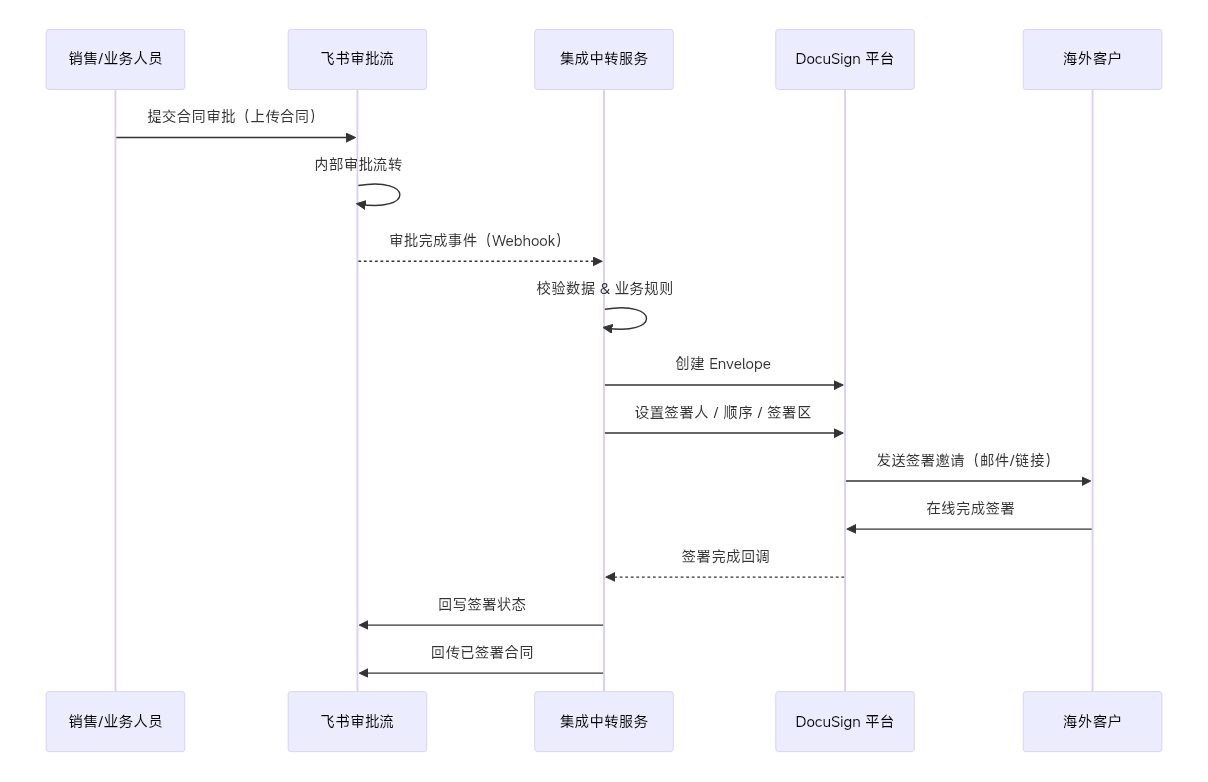 📌注意:Docusign 并非直接对接飞书,而是通过企业可控的中转服务进行连接,以确保安全性、合规性与可扩展性。