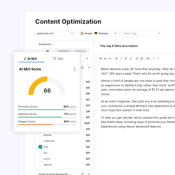 其中,Content Optimization(内容优化)功能会分析内容的相关性、结构和主题完整性,给出针对性建议,帮助企业创建更容易被 AI 引用的内容。内置的 AI 写作功能还可以快速生成符合最佳实践的内容草稿。