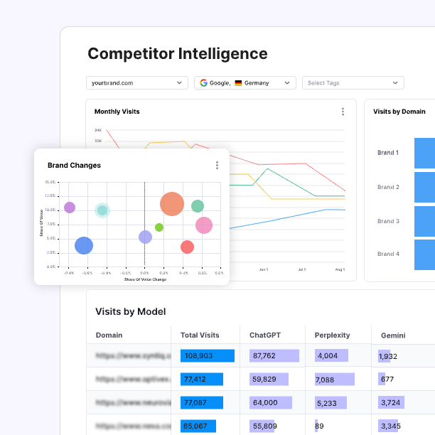 借助这一能力,企业可查看各模型的品牌提及次数和 Share of Voice(声量份额),按品牌、产品线、市场区域细分数据,追踪可见性随时间的变化。